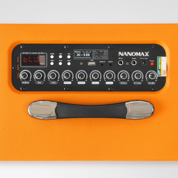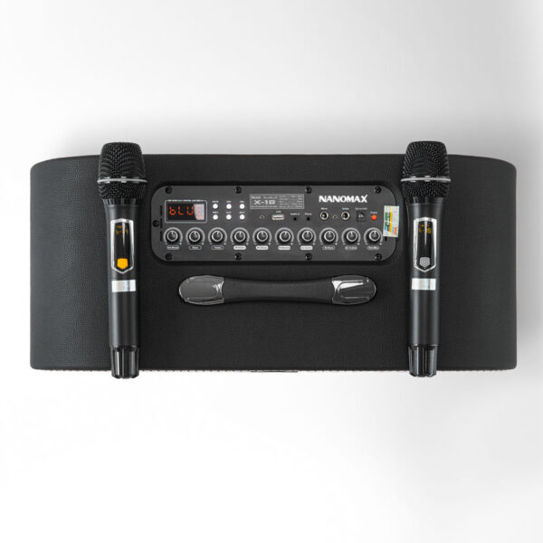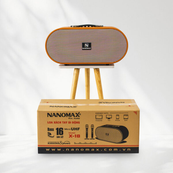 Loa karaoke xách tay Nanomax X-18 được thiết kế hiện đại, bo tròn mềm mại, phối màu da sang trọng, Nanomax X-18 là lựa chọn hoàn hảo cho không gian giải trí gia đình. Trang bị Bass đôi 16cm, Treble đôi 10cm, công suất 350W cho âm thanh sống động. 2 micro UHF không dây, dễ hát, hút giọng cực tốt. Pin bền bỉ 4-8 tiếng, kết nối đa dạng: Bluetooth, USB, thẻ nhớ, nhạc cụ.