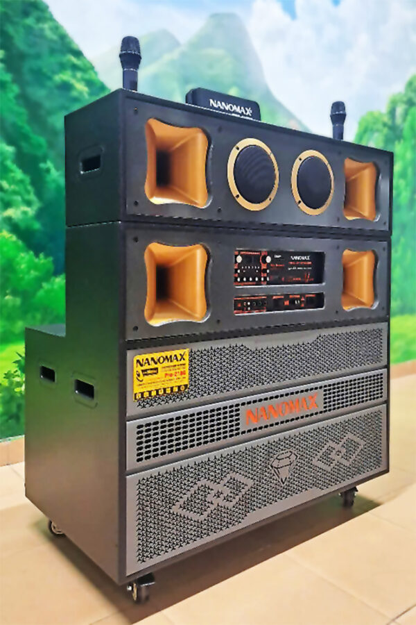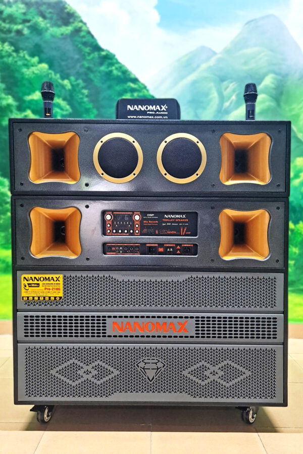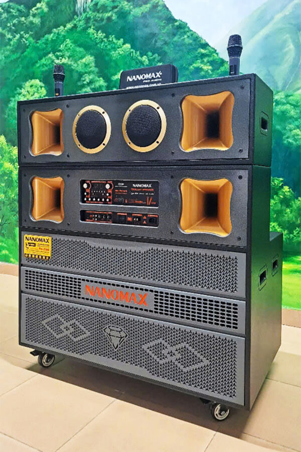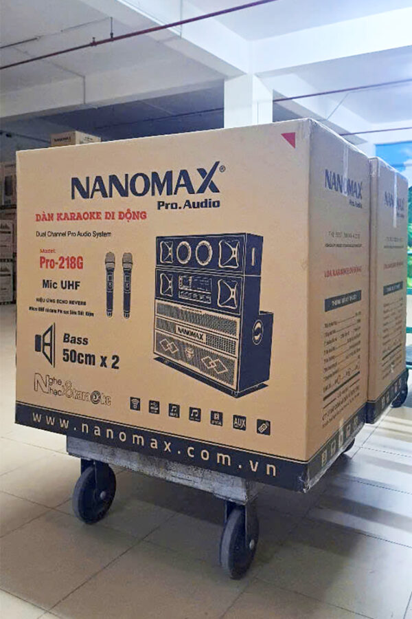 Loa kéo Nanomax Pro-218G thuộc dòng loa Karaoke Bass đôi gập, với cấu hình gồm 2 Bass 5 tấc, 2 Mid 20cm và 4 Treble họng còi, với công suất tối đa lên đến 3000W. Nanomax Pro-218G vừa có thể dùng điện AC-220V vừa có thể dùng bình Ắc qui 12V, nên rất tiện dụng cho việc hát trong nhà cũng như ngoài trời.