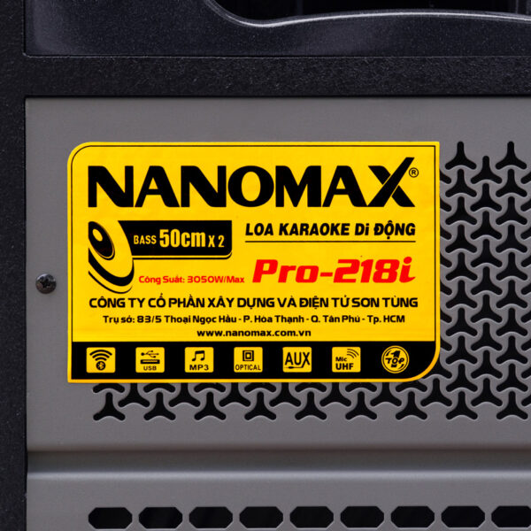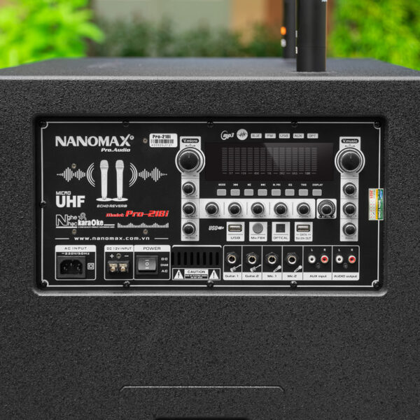 Loa kéo Nanomax Pro-218i thuộc dòng loa Karaoke Bass đôi, với cấu hình gồm 2 loa Bass 5 tấc, 2 loa Mid 16cm và 2 Treble họng còi, với công suất tối đa lên đến 3050W. Loa vừa có thể dùng điện AC-220V vừa có thể dùng bình Ắc qui 12V, nên rất tiện dụng cho việc hát trong nhà cũng như ngoài trời.