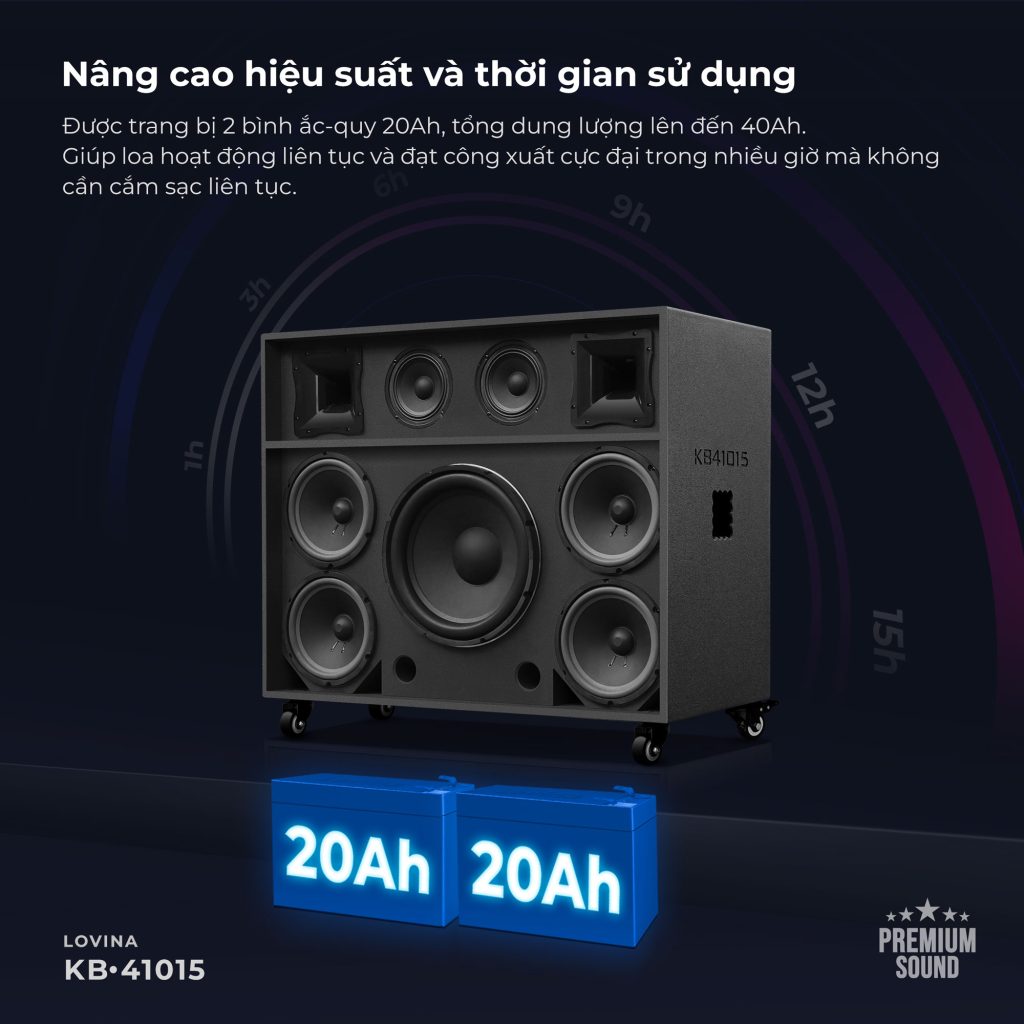 Tích hợp 2 bình ac-qui tổng dung lượng lên tới 40Ah: Hát karaoke thả ga 3 -8 giờ liên tục mà không lo hết bình, đảm bảo cuộc vui luôn bất tận.