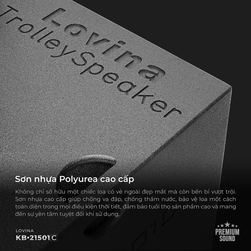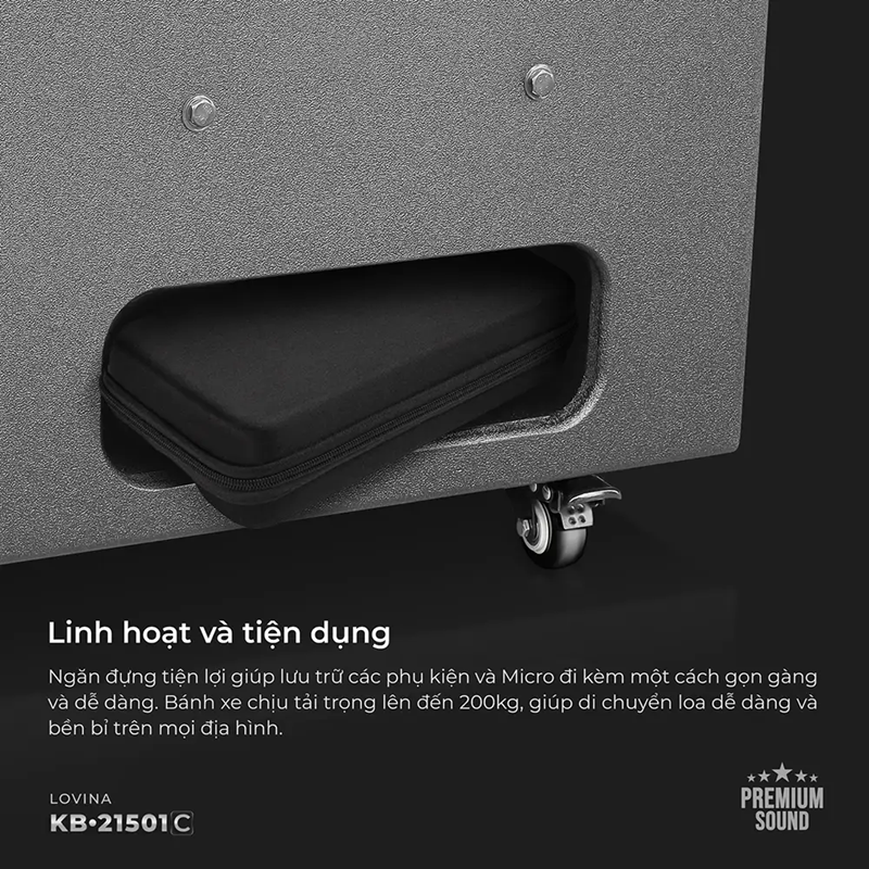 Không chỉ mạnh mẽ về âm thanh, KB-21501C còn sở hữu thiết kế ấn tượng với lớp sơn nhựa cao cấp, chống trầy xước và tăng độ bền cho sản phẩm. Thiết kế chắc chắn nhưng vẫn đảm bảo tính di động với tay kéo, bánh xe linh hoạt, giúp dễ dàng di chuyển ở nhiều không gian khác nhau.