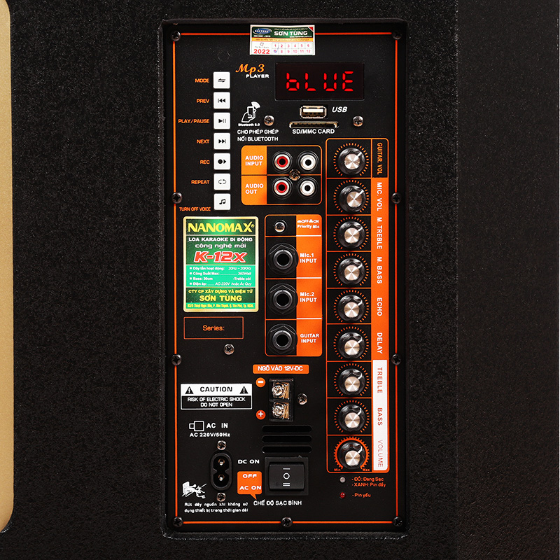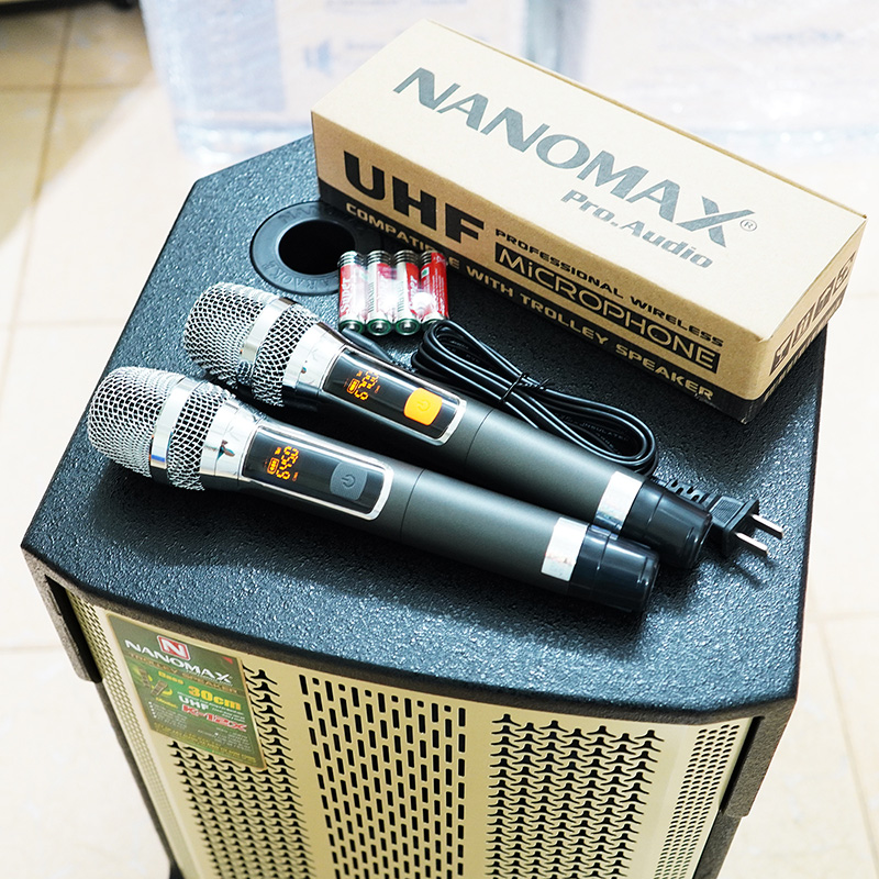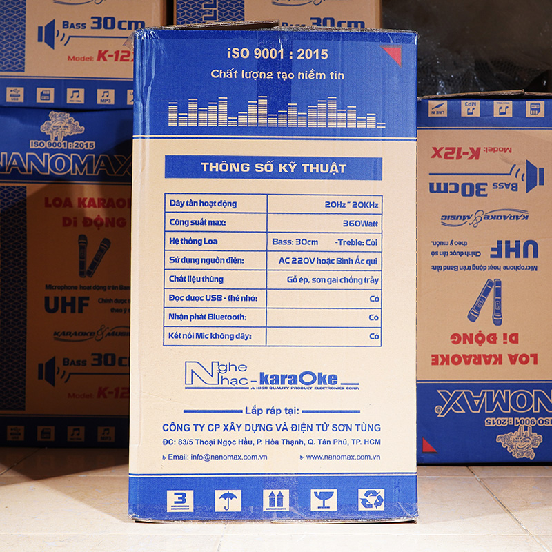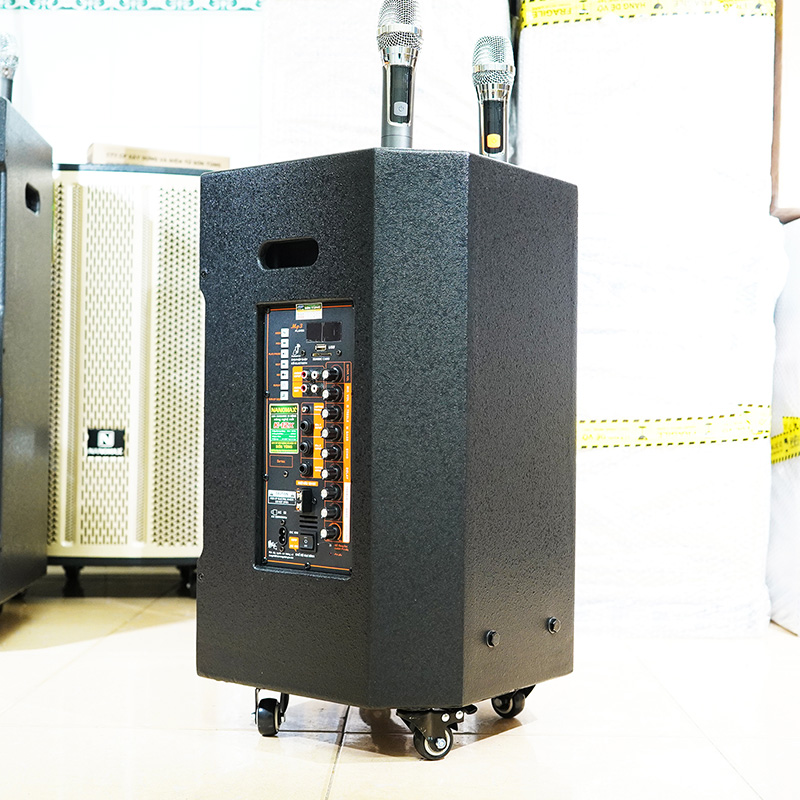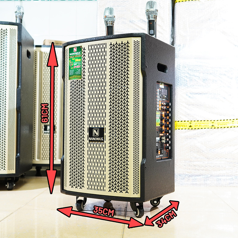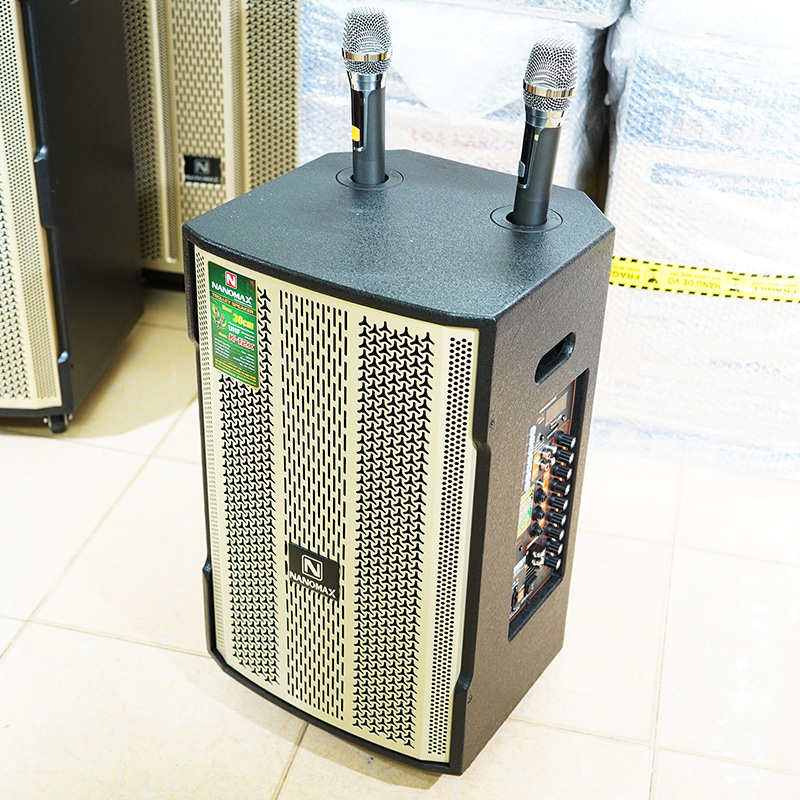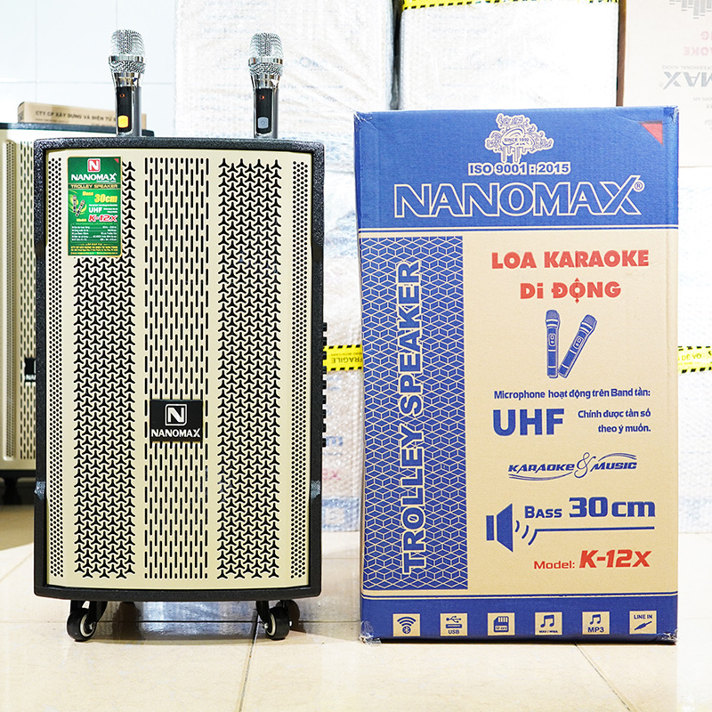 Nanomax K-12X dòng loa kéo bass 30cm, có công suất 360w, 2 đường tiếng, cao 62cm, có chế độ vừa sạc vừa dùng… phù hợp hát karaoke trong nhà, hội trường đáp ứng không gian rộng lên tới hàng trăm mét.