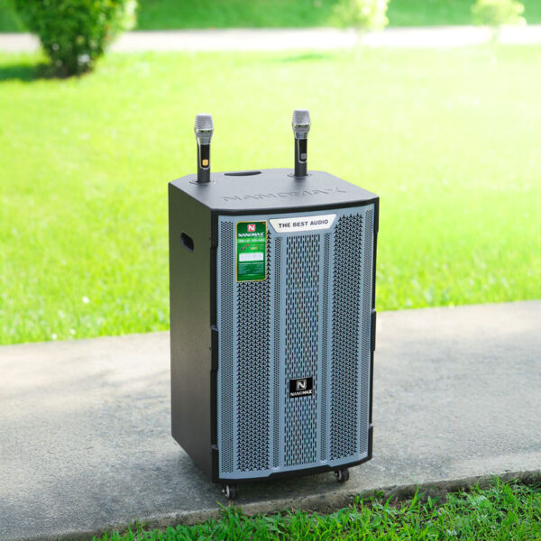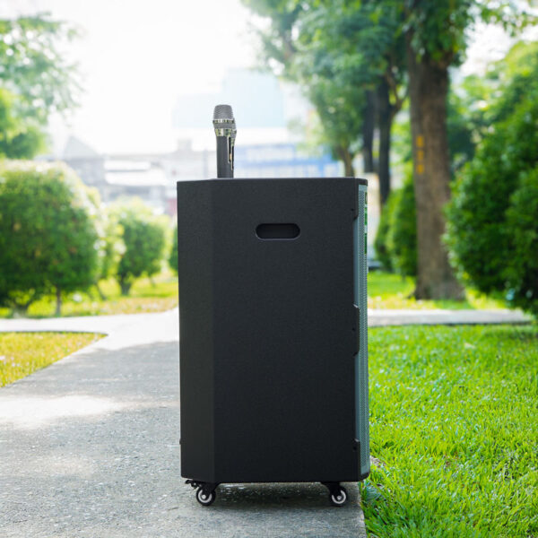 Được sở hữu vẻ ngoài sang trọng, thiết kế kiểu dáng hiện đại, mặt trước thiết kế tấm ê căng bằng kim loại chắc chắn, ngăn côn trùng và bụi bẩn vào trong hệ thống loa gây hư hỏng, thùng loa được làm từ chất liệu gỗ sơn gai màu đen chống trầy và chống nước vững chắc, cứng cáp, cho âm thanh phát ra hay hơn, tạo độ bền cao cho loa. Loa được tặng kèm 2 micro không dây với band tần UHF giúp bạn thỏa sức hát karaoke, tham gia những buổi tiệc hoạt náo ngoài trời. Thiết bị thiết kế tay nắm và bánh xe tiện lợi, cùng trọng lượng nhẹ thuận tiện cho việc di chuyển loa mọi nơi.