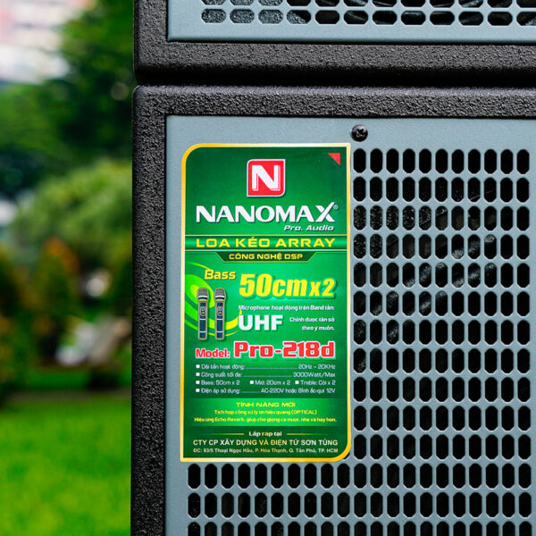 Nanomax Pro-218d là mẫu loa kéo 5 tấc đôi đứng với thiết kế module array bên trên có thể tháo rời. Sở hữu 3 đường tiếng gồm 2 Bass 50cm, 2 loa Mid 20cm và 2 Treble họng còi,… Nanomax Pro-218d là mẫu karaoke array di động chuyên nghiệp có thể đáp ứng được hầu hết thể loại nhạc và karaoke, trong nhà và cả ngoài trời, phục vụ các bữa tiệc lớn.