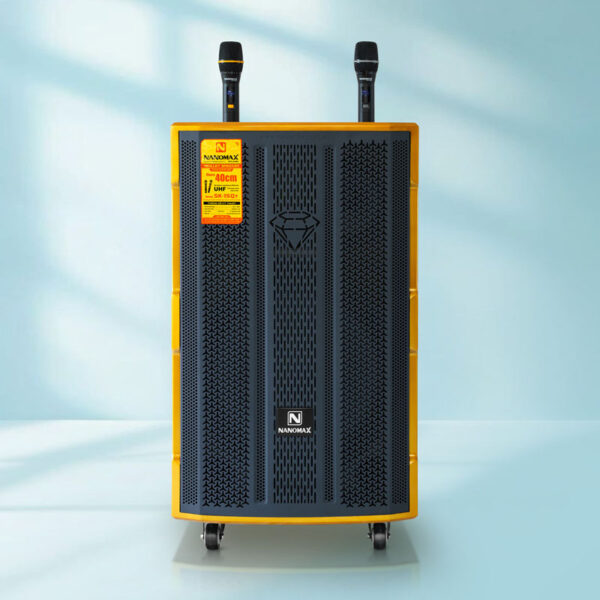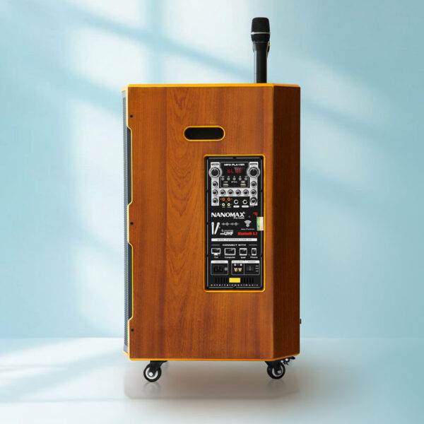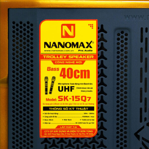 Loa kéo Nanomax SK-15Q7 được trang bị Bass 40cm cho âm thanh uy lực, công suất mạnh mẽ 1150W sẵn sàng thỏa mãn mọi đam mê ca hát. Micro UHF sử dụng pin sạc, hút giọng, dễ hát, kết nối linh hoạt. Thùng gỗ sơn PU vân gỗ kết hợp nhũ vàng nổi bật. Sử dụng pin lithium 15A, độ bền gấp 3 lần ắc quy, cho thời gian sử dụng lâu hơn và ổn định hơn.